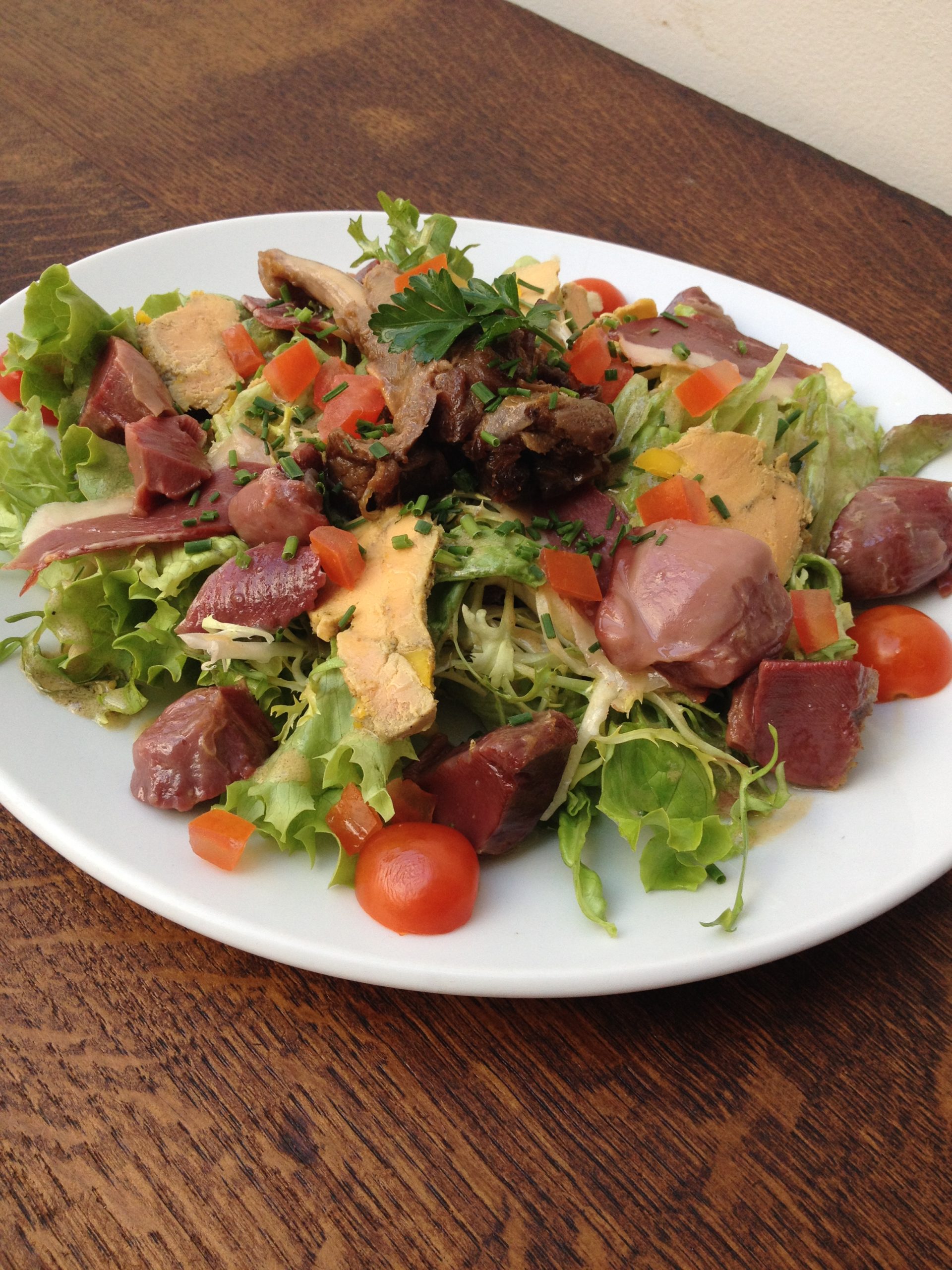Salade Périgourdine (gésiers d’oie, manchons confits, magret fumé et foie gras)
